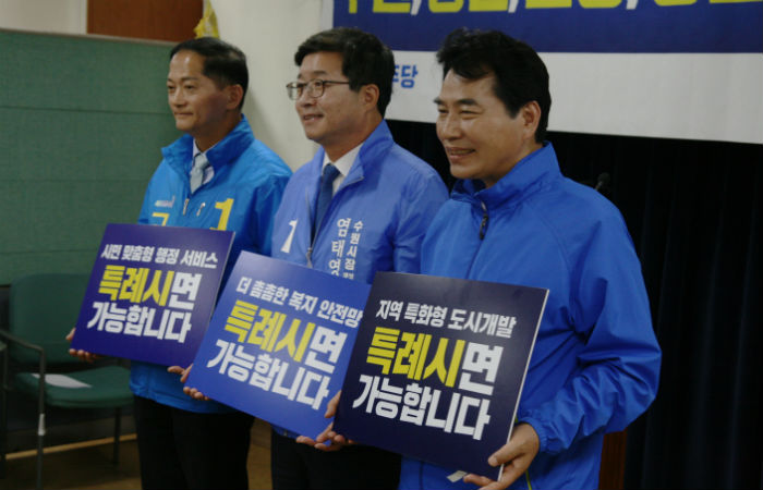 백군기, 염태영, 이재준 시장후보들은 24일 경기도의회 브리핑 룸에서, 기자회견을 열고 "100만 대도시 특례 시 실현을 공동의 과제로 설정하고, 공동대응기구를 구성하기로 했다," 고 밝혔다.