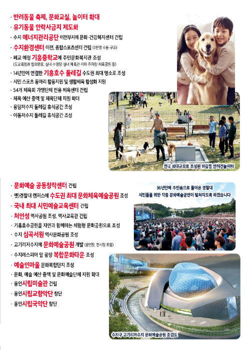 “옛 경찰대 부지에 수도권 최대 문화·예술·체육공원을 조성하고, 기흥호수공원을 자연과 함께 하는 체험형 문화공원으로 만들겠습니다.”
