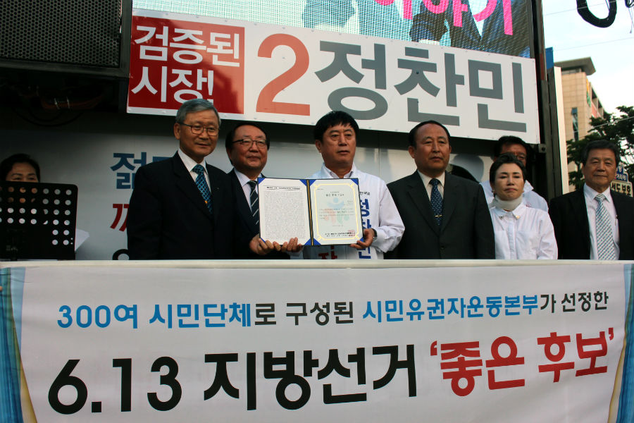 지난 2일, 수지구 풍덕천동에서 가진 출정식에서, 시민단체로부터 ‘좋은 후보’로 선정된 정찬민 용인시장 후보가 공식으로 인증서를 전달받았다.