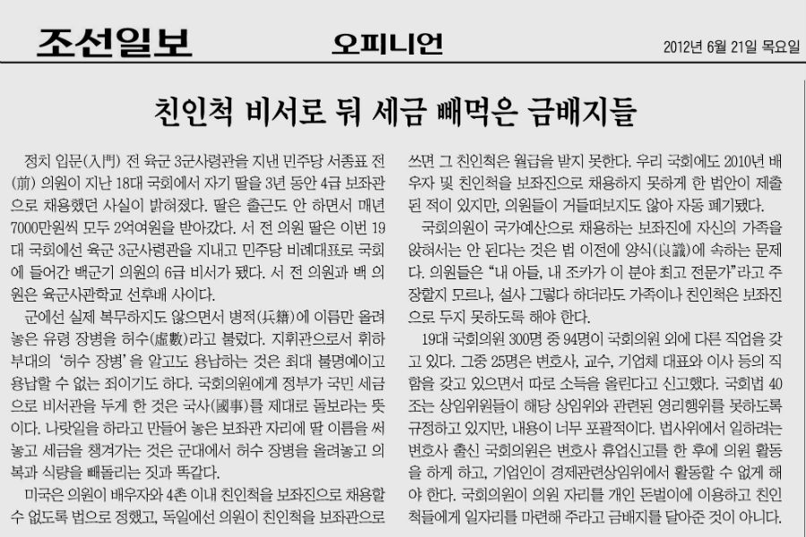 대변인은 “당시 백 후보의 보좌진 특혜채용 사실은, 유명 언론의 사설에 까지 ‘친인척을 보좌진으로 둬 세금을 빼먹은 금뱃지’라는 글로 비판을 받은 적폐인물”이라며 “과연 용인시장으로서 자격이 있는 인물인지 의문”이라고 강조했다.