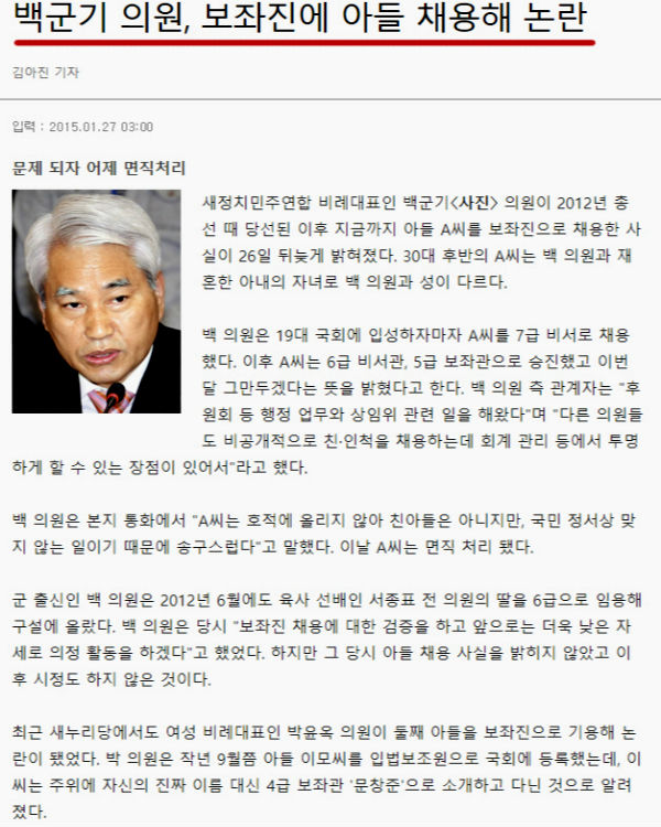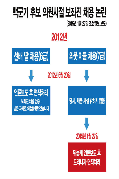 또 “백 후보는 2012년 6월 선배 딸 채용 사실이 언론에 알려지자, 사과하고 면직 처리하면서 아들 채용 사실을 숨겼다” 며 “3년 뒤인 2015년 아들 채용 사실이 뒤늦게 언론에 보도되자, 아들을 면직 처리하는 등 채용 사실을 은폐하기도 했다,” 고 지적했다.