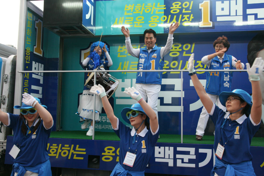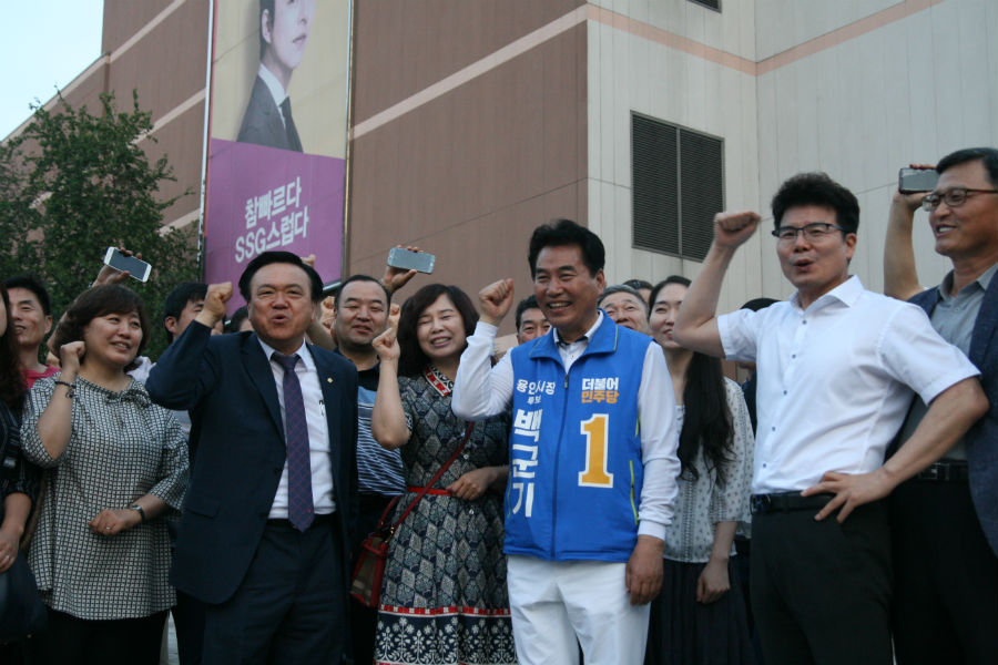 더불어민주당 백군기 용인시장 후보가 지난 7일 기흥구 영덕동 흥덕이마트 앞 거리에서 집중유세를 펼치며 유권자들의 표심을 공략했다.