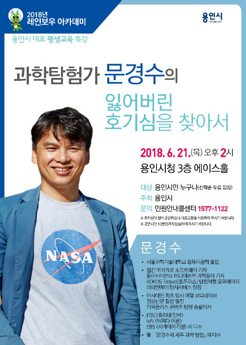 용인시는 오는 21일, 시청 에이스 홀에서 시민을 위한 명사 초청 무료강좌인 ‘레인보우 아카데미’의 6월 행사로, 과학탐험가 문경수의 특강을 마련한다.