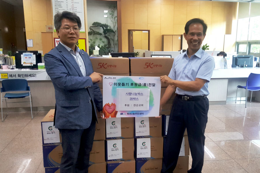 용인시 수지구 죽전2동은 지난 18일 한순교회에서, 어려운 이웃을 위해 써 달라며 라면‧김‧햇반 등의 생필품이 들어있는 사랑나눔박스 20개를 기탁했다고 밝혔다.