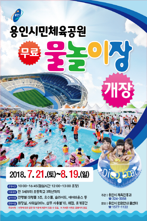 용인시는 처인구 삼가동 시민체육공원 주경기장서, 오는 21일부터 8월19일까지 30일 동안 휴일 없이 무료 물놀이장을 운영한다고 밝혔다.