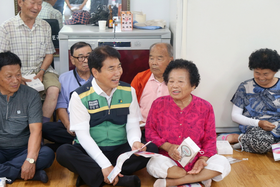 백군기 용인시장은 23일 포곡읍 삼계4리 경로당을 방문해, 어르신들의 건강 상태를 확인하고, 역삼동 명지대 사거리 등에 설치된 그늘막을 점검하면서 시민들에게 시원한 생수를 나눠줬다.