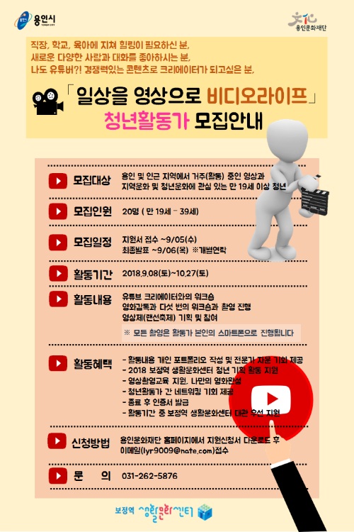 (재)용인문화재단(이사장 백군기) 보정역 생활문화센터에서는, 용인 청년 생활문화 축제 기획자 양성을 위해, 영상을 함께 공부하고 축제를 기획 할 청년 활동가 20인을 오는 9월 5일까지 모집한다.