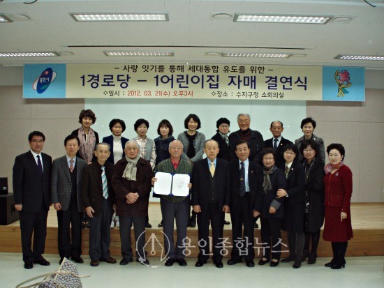 수지구는 지난 21일 구청사 회의실에서 어린이집과 경로당 대표자 18명이 모여 협약서에 서명하고 결연을 맺는 자리를 가졌었다.