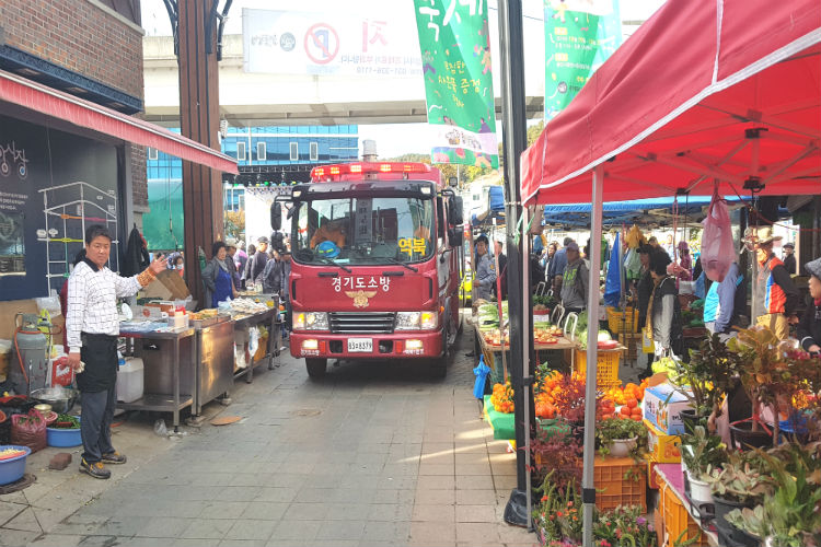 용인소방서(서장 서은석)는 지난 25일 용인중앙시장에서 소방차 진입로 확보 및 재난현장 골든타임 확보를 위한 소방차 길터주기 및 현지적응훈련을 실시했다.