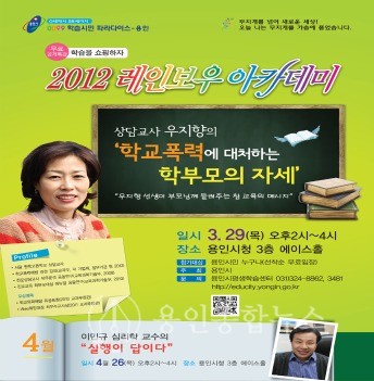 레인보우아카데미는 올해 용인 시민의 지적 욕구 충족과 삶의 질 향상을 위해 자기계발, 여성․가족, 경제, 교육, 행복, 건강, 교양 등 다양한 분야의 7인 전문 강사를 초청해 7색 테마별 강좌를 연다. 오는 4월 26일에는 ‘끌리는 사람은 1%가 다르다’의 저자이며, 아주대학교 교수인 이민규 강사의 ‘실행이 답이다’란 주제로 강좌가 열린다.