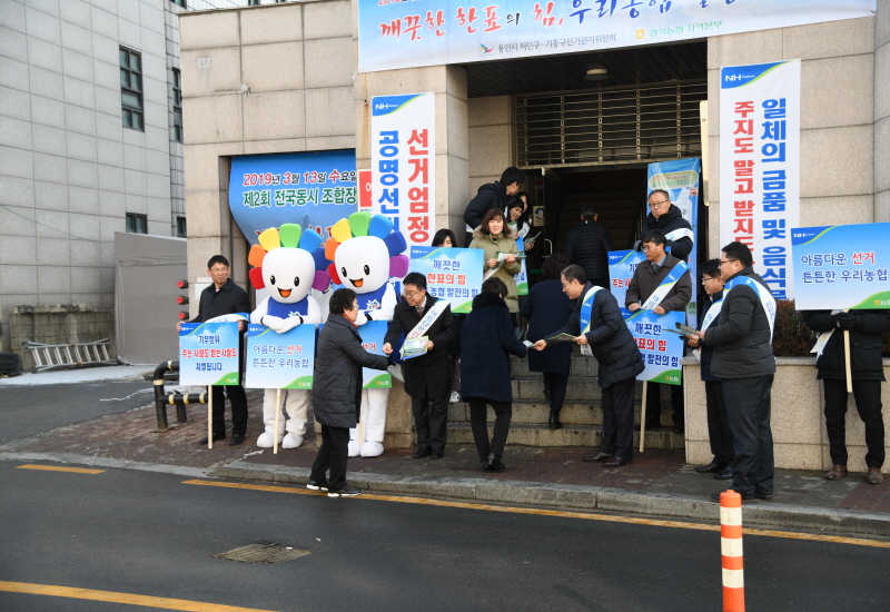 용인시처인구·기흥구선거관리위원회와 경기농협·용인농협은 28일 용인농협 정기총회 현장에서 오는 3. 13. 실시하는 제2회 전국동시조합장선거를 앞두고 조합원과 농협 임·직원 등을 대상으로 ‘공명선거 캠페인’을 펼쳤다.