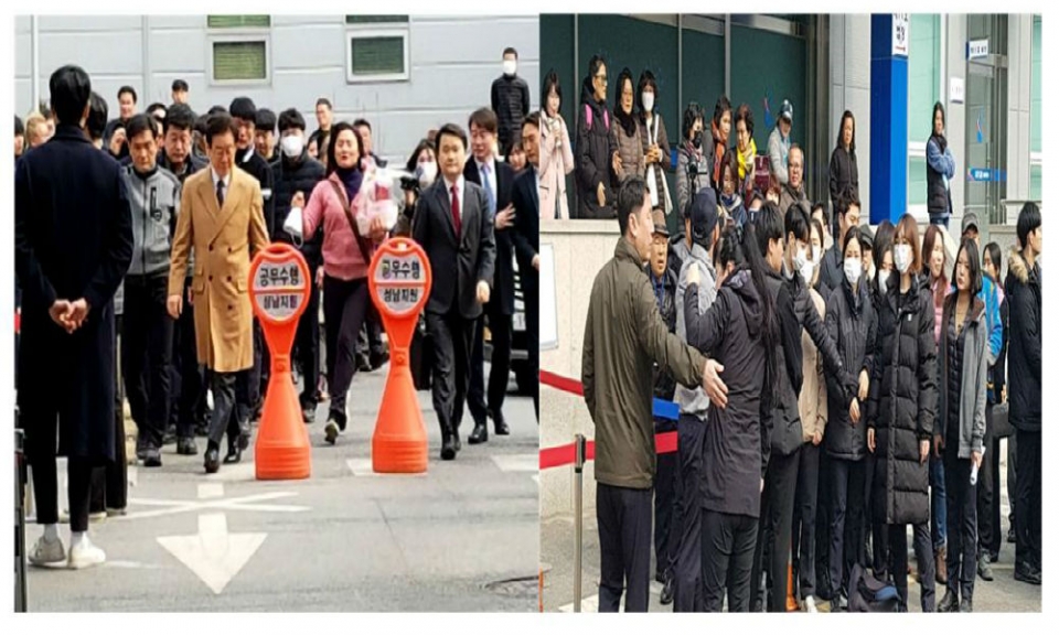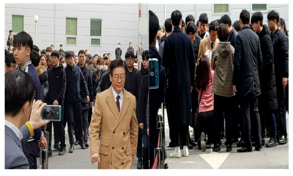 이지사가 차에서내려 법정으로 걸어가자, 지지자들은"이재명"을 연호하고 반대자들은"구속"을 외치는 가운데, 한 여성지지자가 이지사에게 화이팅의 꽃다발을 안겨주자, 이지사는 꽃다발을 받아 수행원에게 건넸으며, 가벼운 미소와 목례로 화답한 뒤, 다시 법정입구로 걸어갔으며, 출입문앞에서는 취재진들에게 목례를 하는 등, 여유로운 모습을보이며, 최대분수령이 될, 법원안으로 들어갔다.