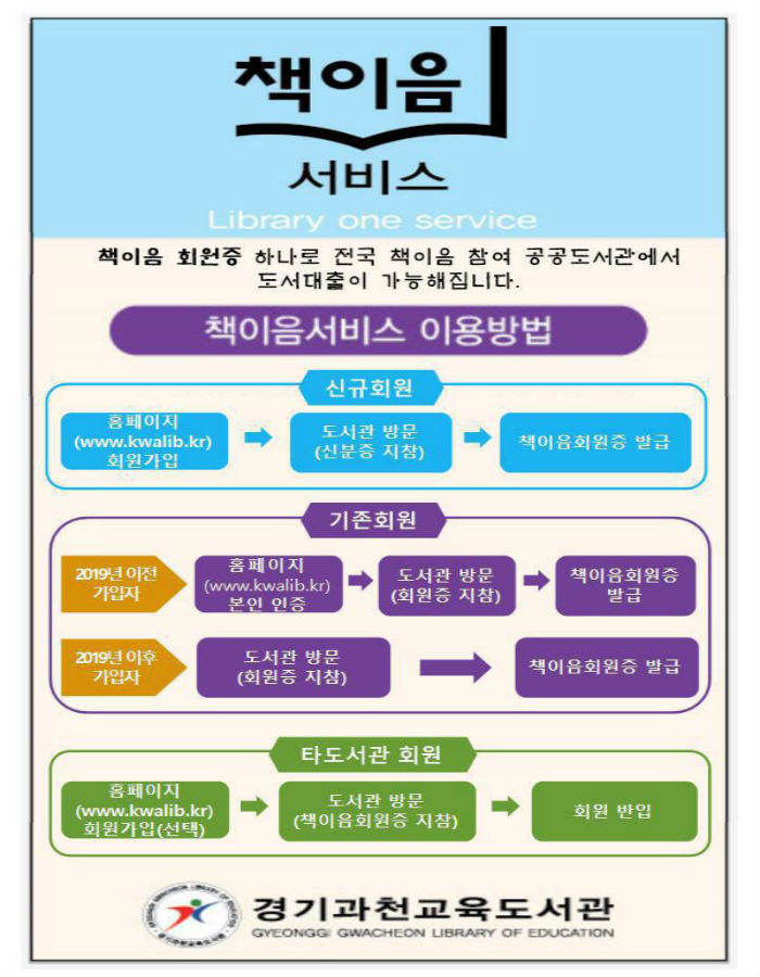 경기과천교육도서관(관장 권우섭)은 하나의 회원증으로 공공도서관에서 도서대출이 가능한‘책이음서비스’를 3월 20일부터 실시한다.