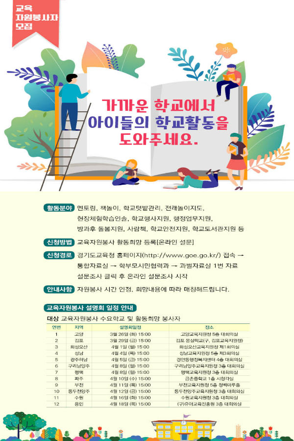한편, 경기도교육청은 더 많은 교육자원봉사자 모집을 위해 4월 18일까지 교육자원봉사 설명회를 진행하며, 교육자원봉사 신청은 경기도교육청 홈페이지(http://www.goe.go.kr/) 학부모시민협력과 통합자료실에서 온라인‧모바일로 접수 가능하다.