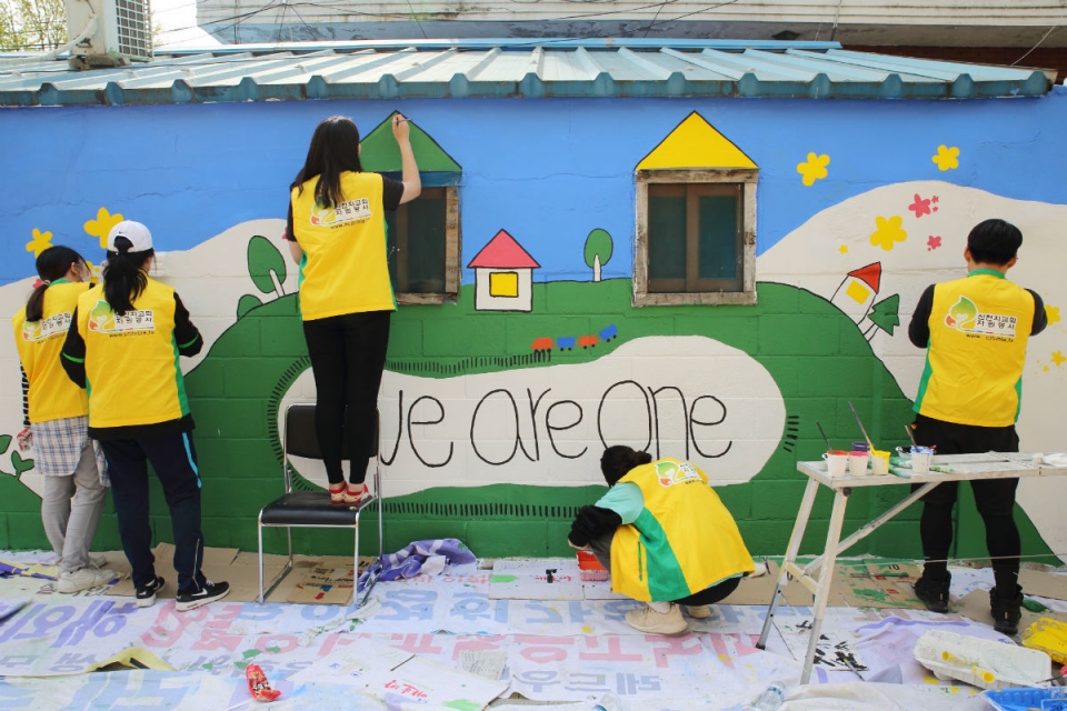 이번 벽화봉사는 ‘We are one'이라는 주제로, 평화를 염원하는 뜻을 담아 담벼락에 꽃과 산 평화에 어울리는 벽화를 탄생시켰다.