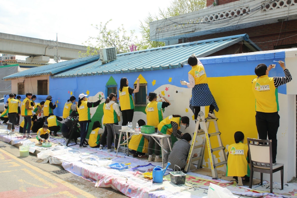 신천지자원봉사단 용인지부가 지난 28일, 처인구 김량장동에 위치한 주택 외벽에서 ‘제7회 담벼락 이야기’ 벽화봉사를 실시했다.
