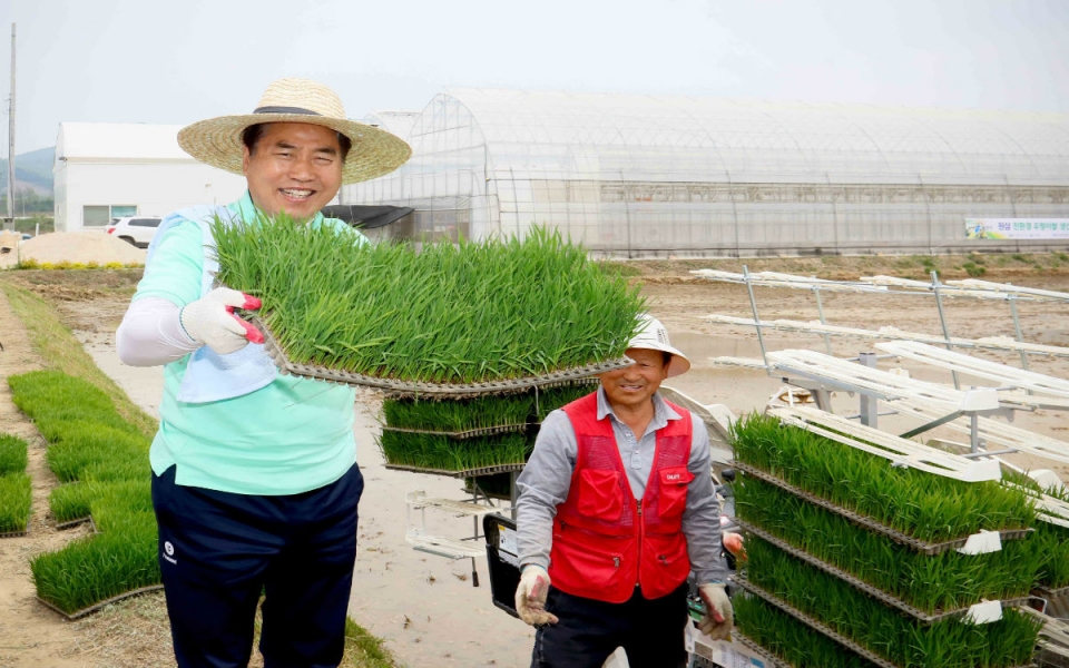 백군기 용인시장은 13일 친환경쌀생산단지인 처인구 원삼면 두창리 용수마을에서 올해 풍년을 기원하는 모내기 행사에 참여했다.