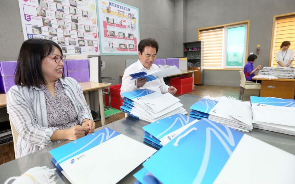 백군기 용인시장, 근로장애인들과 함께 작업하며 격려