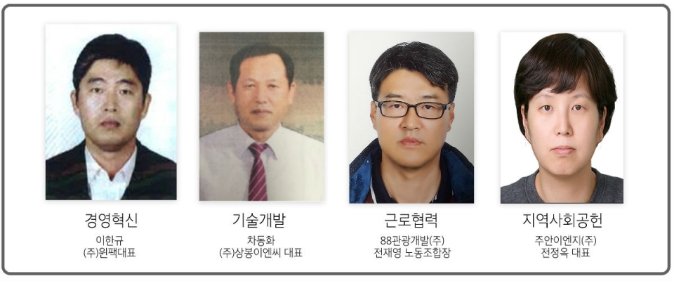 수상자는 경영혁신 부문의 이한규 ㈜윈팩 대표, 기술개발 부문 차동화 ㈜상봉이엔씨 대표, 근로협력 부문 88관광개발(주) 노동조합, 지역사회공헌 부문 주안이엔지(주) 등이다.