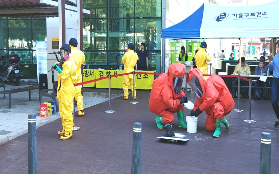 이날 훈련은 기흥․수지구보건소와 용인동부경찰서, 용인소방서, 강남병원 합동으로 백색가루를 이용한 탄저 바이러스 테러 상황을 설정해 시민들을 구조하는 방식으로 진행됐다.