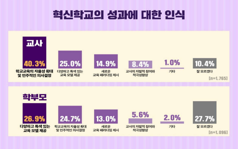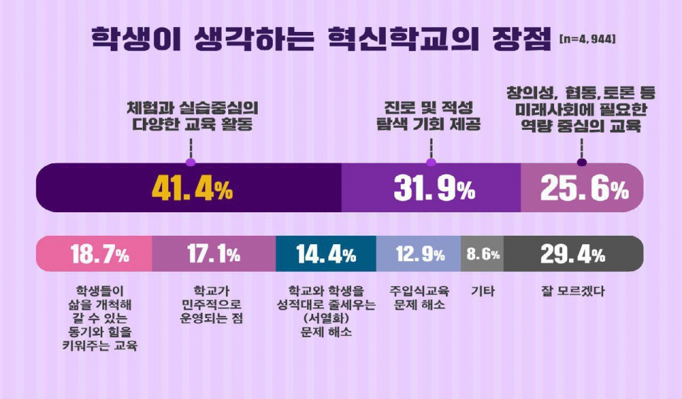 2014년에는 혁신학교가 전체 학교 수의 10%를 넘어섰다. 자연히 학교 간에 격차가 만들어졌다. 더욱 심각한 것은 혁신학교를 졸업한 학생들이 상급학교로 진급하면서 혁신학교로 갈 수 없다는 것이었다. 학교와 학교 간에 혁신교육이 이어지지 않는다는 것은 학생들에게는 혼란스러운 것이었다. 그래서 대안으로 나온 정책이 2015년부터 시행한 혁신공감학교이다. 혁신공감학교는 혁신학교로 발전하기 이전 단계로서, 교사들의 동의를 얻어 혁신교육을 학급별로 또는 학년별로 진행하는 학교들이 지정되었다. 또 하나의 정책은 지역을 혁신교육지구로 지정하는 것이었다. 지방자치단체들이 지역의 특성에 따라 학교와 학교교육을 지원하는 체제를 만들었다. 인력지원, 교육환경개선 그리고 교육프로그램의 지원이 중심 사업이었다. 이제는 경기도의 거의 모든 시군들이 혁신교육지구로서 교육청과 업무협약(MOU)을 맺고 교육 사업에 참여하고 있다.