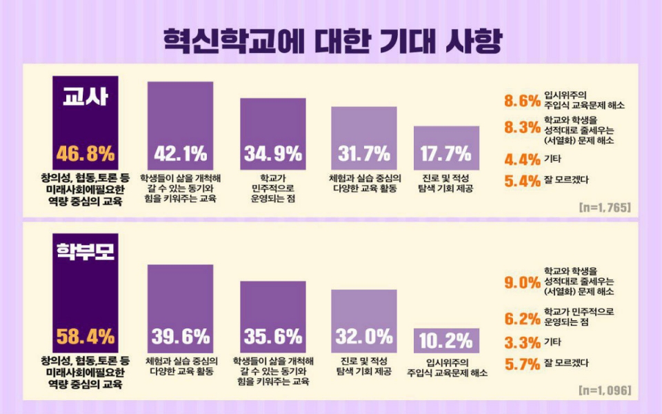 혁신학교가 학교 안에서의 교육혁신에 집중하였다면 마을교육공동체운동은 학교 밖에서 혁신교육의 모형을 만들어 갔다. 꿈의 학교와 꿈의 대학은 각각 마을을 기반으로 하거나 대학과 연구기관의 참여로 새로운 “학생중심” 교육의 길을 만들었다. 2019년 꿈의 학교는 1,908교에 달할 만큼 성장하였고, 꿈의 대학은 95개의 대학과 24개의 기업연구소, 기관 등이 참여하여 1,200여개의 강좌를 개설하고 학생들의 자율적인 선택으로 운영하고 있다. 이것은 단순한 혁신교육의 확장이 아니라 학교와 마을을 통합하여 나가는 새로운 과정이라고 할 수 있을 것이다. 혁신교육은 교육자체의 변화만이 아니라 학교와 지역사회 모두를 교육이라는 과제를 통하여 혁신하고 있다.