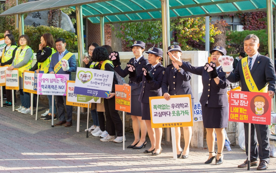 이날 이 의장과 황 위원장은 용인서부경찰서 여성청소년과의 주최로 열린 캠페인에서 박온서 대지중학교장 및 학교 관계자, 학생들, 김지수 학부모 폴리스 연합회장 및 연합단, 학부모, 경찰 관계자 등 50여 명과 함께 등교하는 학생들에게 학교 폭력의 중요성을 강조했다.