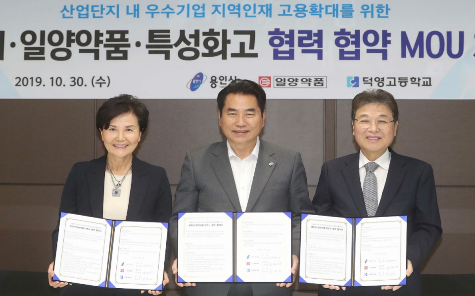 용인시는 30일 시장실에서 관내 기업인 ㈜일양약품, 관내 학교인 덕영고등학교와 지역인재 고용 확대를 위한 업무협약을 체결했다.