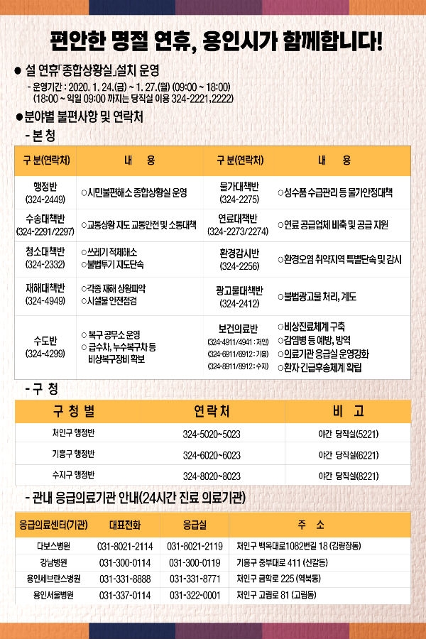 (종합상황실 : 시청(031)324-2449, 처인구(031)324-5020, 기흥구(031)324-6020, 수지구(031)324-8020)
