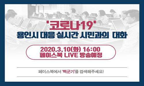페이스북 LIVE 방송 예정 용인시에서는 10일 오후 4시부터 고로나19 사태에 대해, ‘용인시 대응 실시간 시민과의 대화’를 실시한다. 또한 페이스북 LIVE 방송도 예정되어있다. 저작권자 © 용인종합뉴스 무단전재 및 재배포 금지 천홍석 기자 다른기사 보기