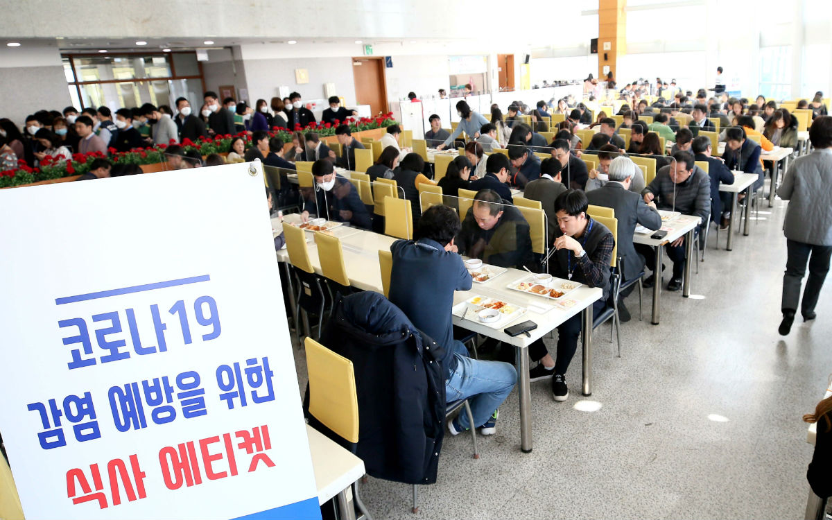 용인시 직원들이 16일 코로나19 예방을 위해, 가림막이 설치된 시청 구내식당에서 2교대로 점심을 먹고 있다.