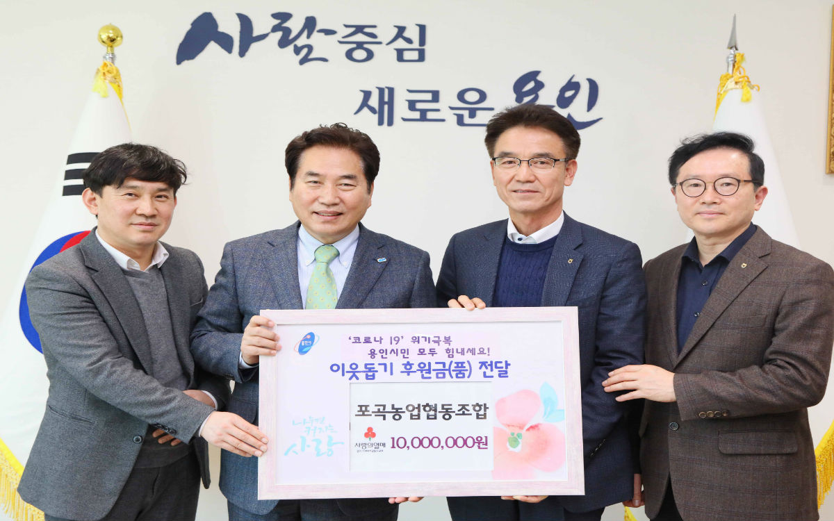용인시 포곡농업협동조합 김순곤 조합장 등 관계자 3명이, 백군기 시장을 찾아와 어려운 이웃을 위해 써 달라며 성금 1000만원을 전달했다.