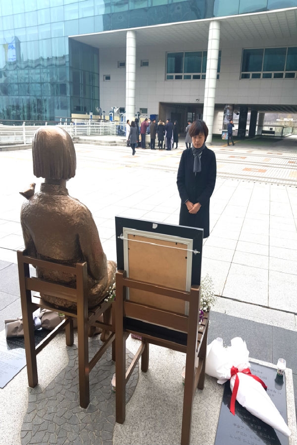 17일 오후 2시 용인시청에 위치한 용인 평화의 소녀상 앞에서는, 고 김복동 할머니의 49제 1주년 기제가 진행됐다.