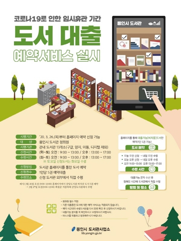 용인시는 27일 시민들이 안심하고 책을 빌려보도록, 도서관 임시 휴관기간 예약 대출제를 시행한다고 밝혔다.