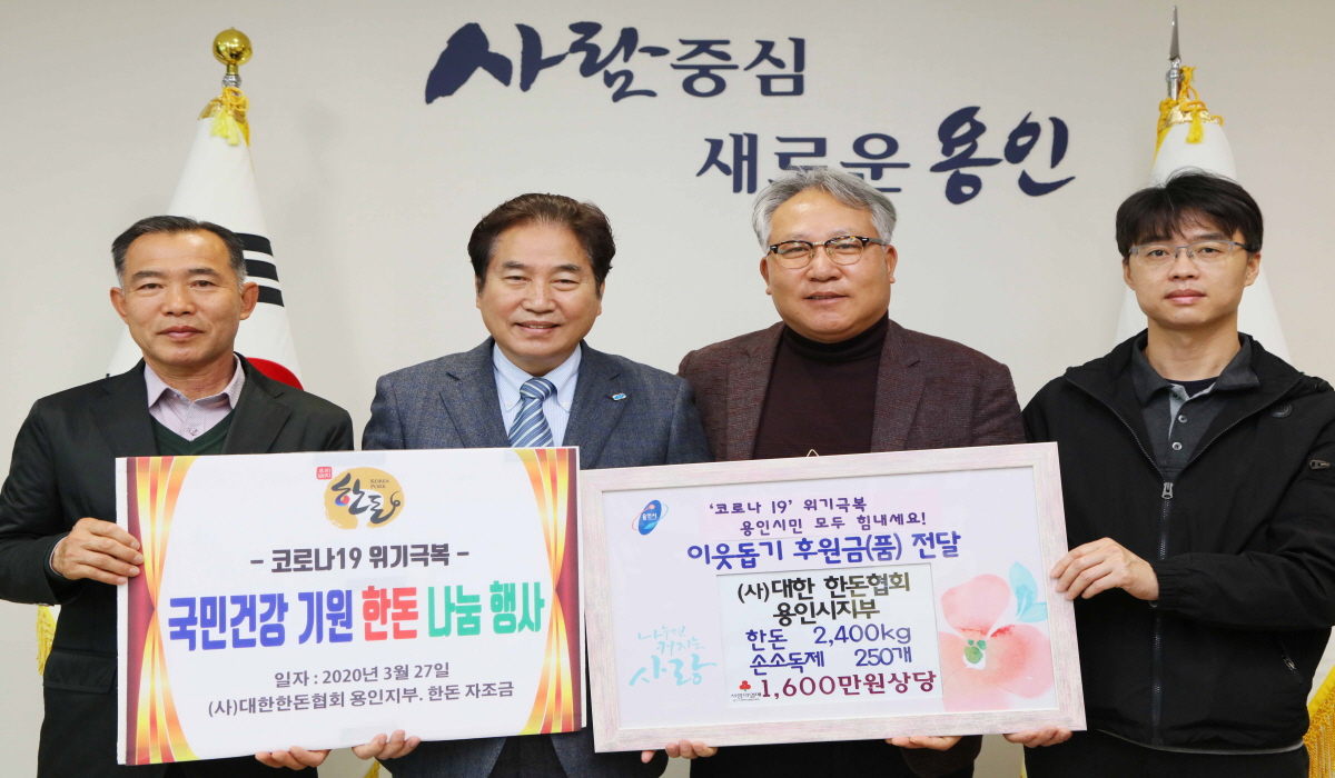 이날 서정용 대한한돈협회 용인시지부장과 임직원들이, 백군기 시장실을 방문해 1600만원 상당의 돼지고기 2400kg과 손소독제 250병을 기탁했다.