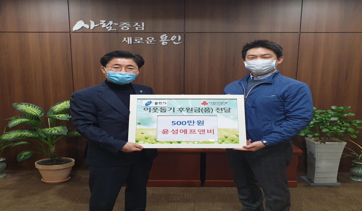 한편, 이날 수지구 풍덕천동 낚시업체 윤성에프엔비도, 구청을 찾아와 이웃돕기 성금 500만원을 기탁했다.