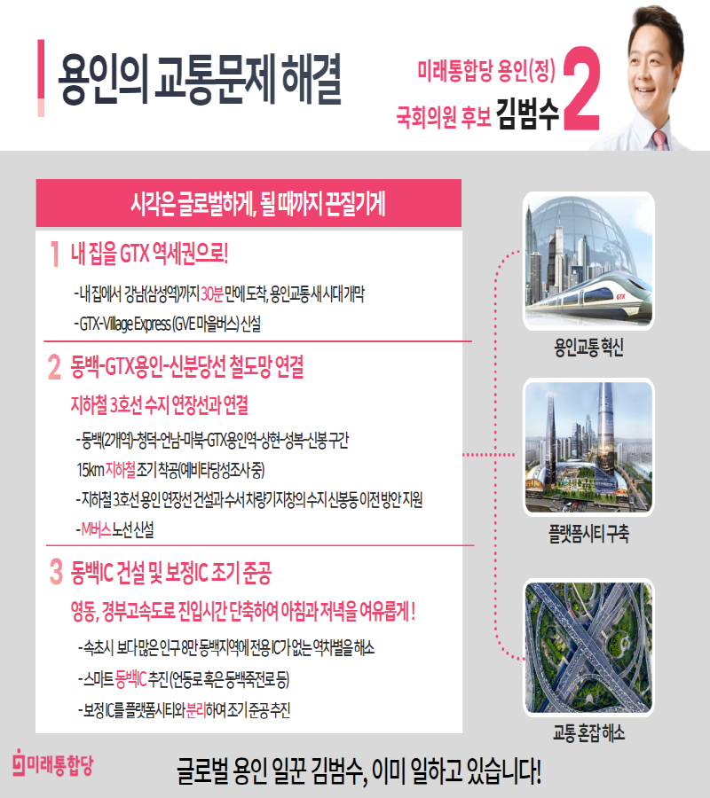 제21대 국회의원선거 용인정 미래한국당 김범수 후보는 일찍이 교통, 교육, 문화예술분야 공약을 발표하고, 주민들과의 간담회를 통해 지역 민심을 적극 청취하고 있다.