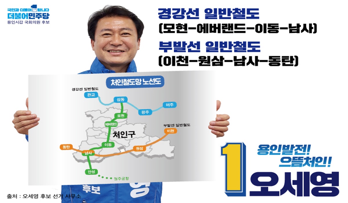 더불어민주당 용인시갑 오세영후보는, 용인처인 및 수도권 동부지역의 교통정책 강화와 교통불편 해소 및 지역균형 발전을 위해, 경기도 광주를 지나 에버랜드, 이동, 남사를 연장하는 경강선 일반철도와 이천, 원삼, 남사를 잇는 부발선 일반철도를 구축하는 데 최선을 다하겠다고 밝혔다.