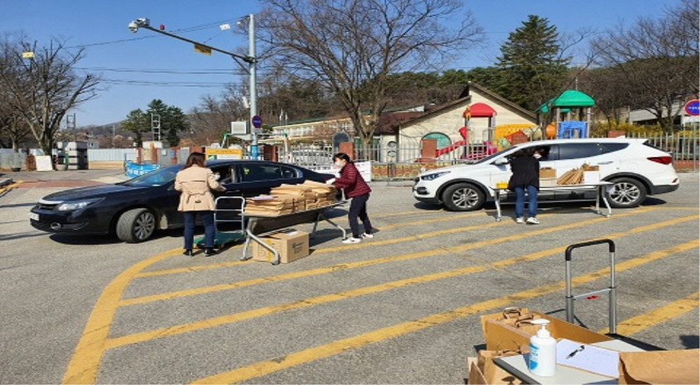 용인교육지원청 제일초등학교(교장 서미영)에서는, 학생들의 학습 공백을 최소화하고 온라인 개학 준비를 위하여, ‘드라이브 스루’를 이용한 새 학기 교과서 배부를 하였다.