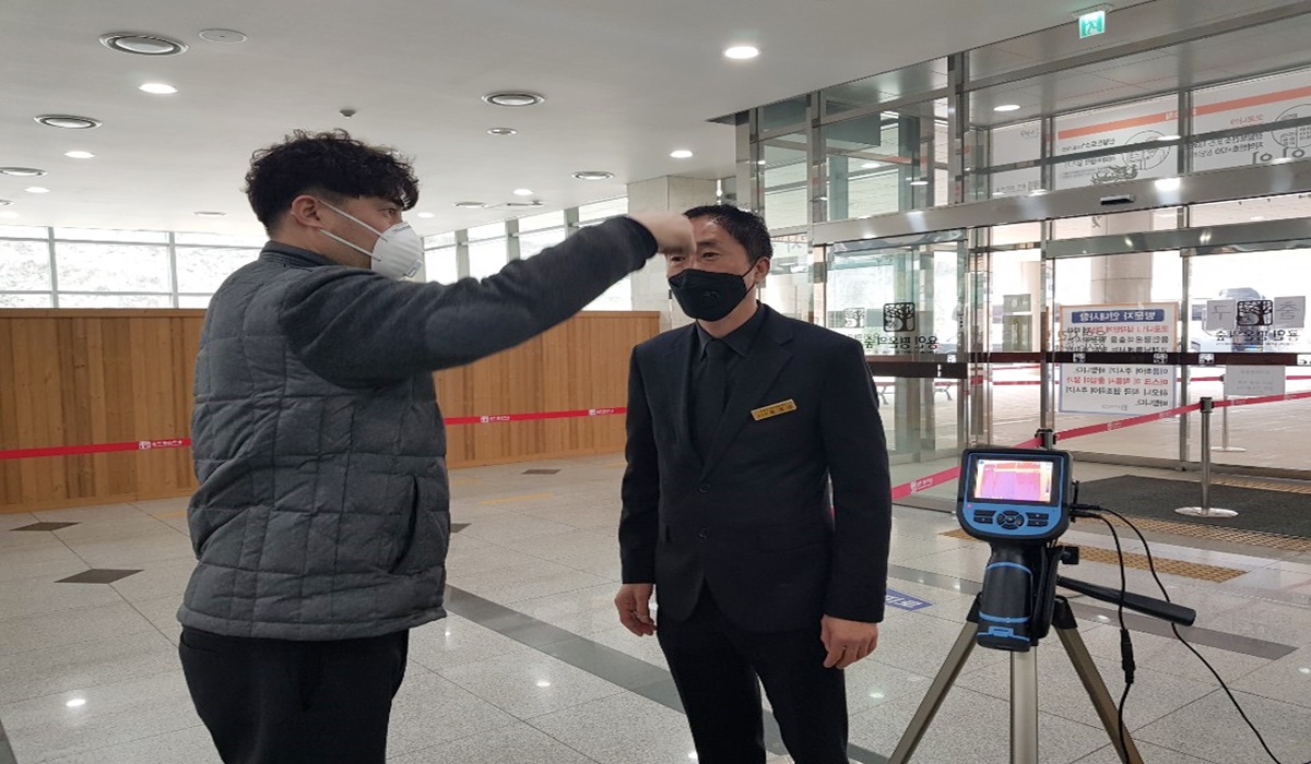 용인도시공사 One-Stop Total 장사시스템 용인평온의숲에서는, 코로나 19 확산 차단에 선제적으로 대응하고자, 나래원(화장시설) 1층 출입구에 열화상 카메라를 설치해, 나래원 입장하는 모든 직원․유족들을 대상으로 발열 여부를 확인하고 있다.