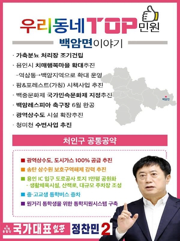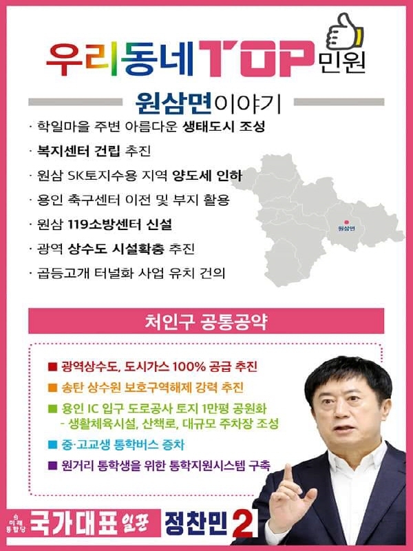 미래통합당 용인갑 국회의원 후보인 정찬민 전 용인시장은 9일, 처인구 관내 11개 읍면동에 대한 공약을 3개 지역으로 나눠 소개하기로 하고, 첫 번째로 남사,원삼, 백암지역을 발표한다고 밝혔다.