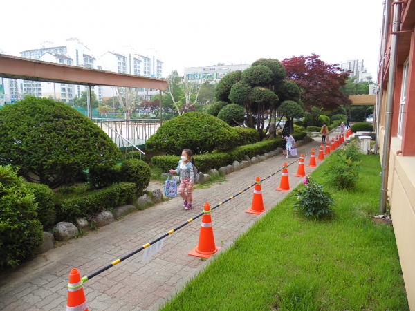 학생들은 등교 안내 길을 따라 앞뒤 간격을 유지하며 열 체크 및 손 소독을 하고 교실로 들어와 새로운 담임선생님과 친구들을 만났다.