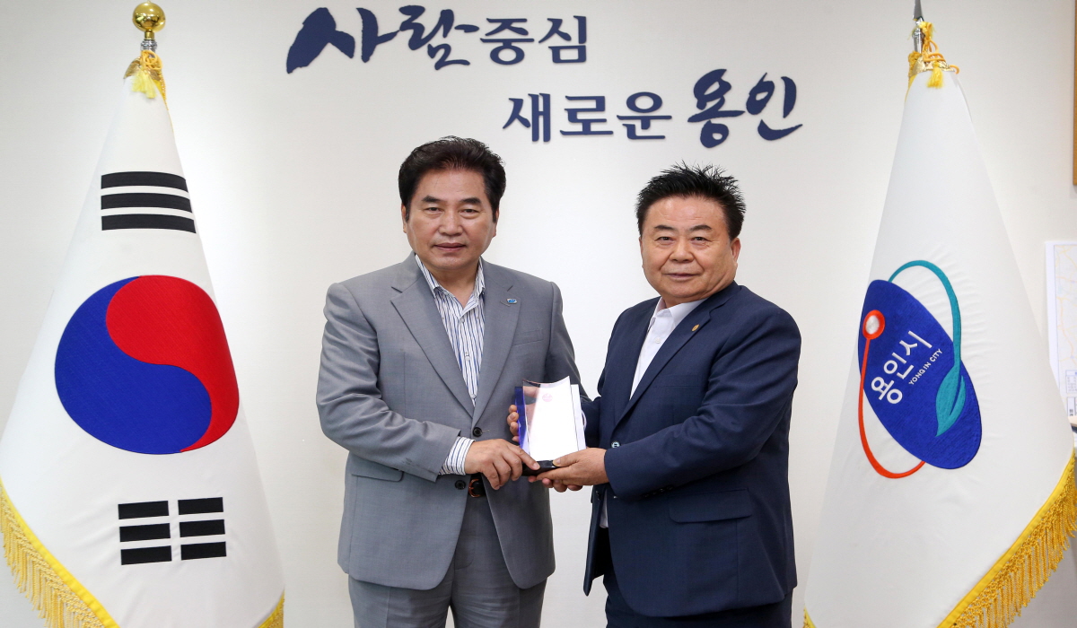 “용인시는 14일 문진섭 서울우유협동조합 용인공장 조합장 등 3명이, 백군기 용인시장실을 찾아와 감사패를 전달했다고 밝혔다.