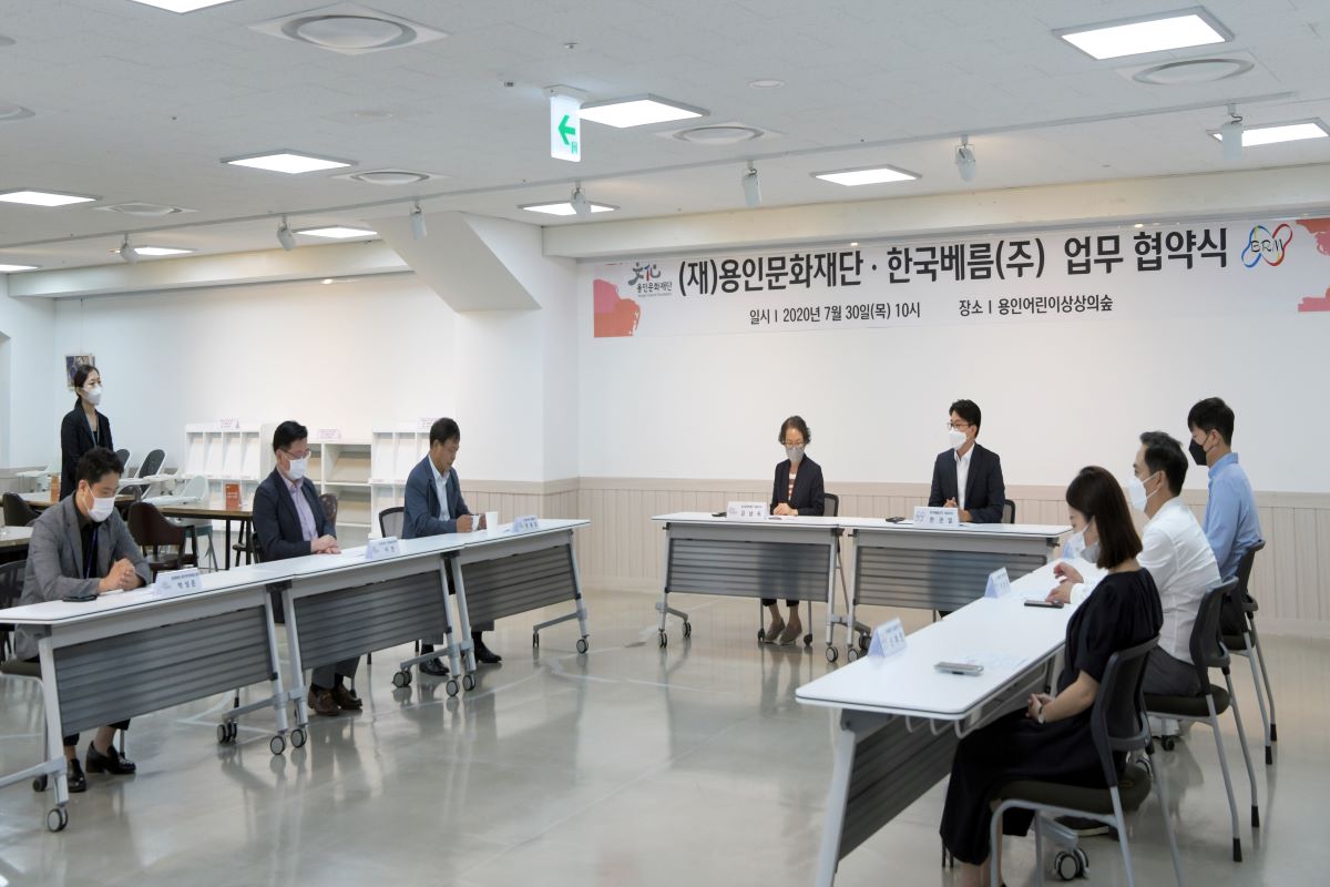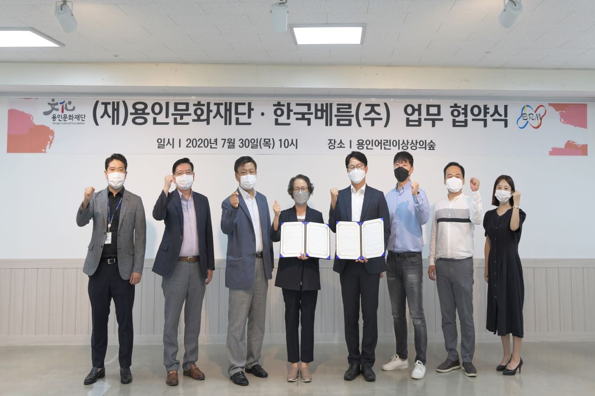 (재)용인문화재단(이사장 백군기)과 한국베름주식회사(대표이사 한권일)가, 용인시민의 문화 향유와 건강증진 활동을 통한 사회적 가치 공동이행을 위해, 지난 7월 30일(목) 오전 10시에 용인어린이상상의숲에서 업무협약을 체결했다.