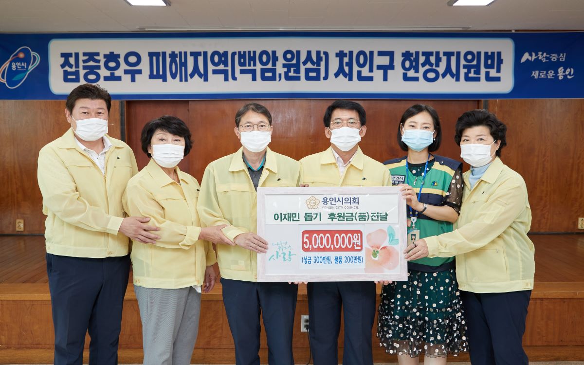 이번 기부는 지난 1일부터 계속된 집중호우로 인해 피해를 입은 지역주민들의 고통을 위로하고, 작은 도움이나마 힘을 보내기 위한 것으로, 용인시의회 의원 29명 전원의 자발적인 참여로 이루어졌다.