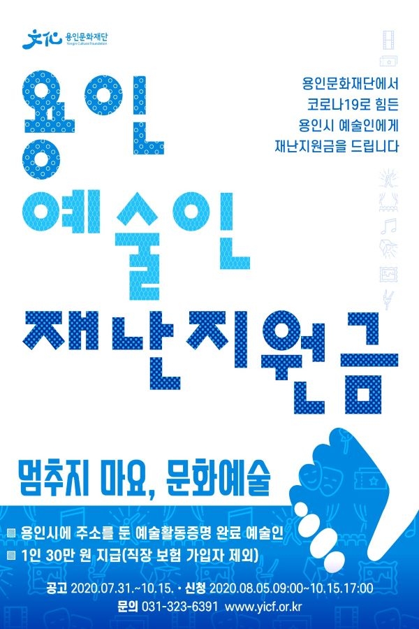 (재)용인문화재단(이사장 백군기)은 코로나19 사태가 심각해짐에 따라 경제적 어려움을 겪고 있는 용인 예술인들에게 지원금을 지급하는 <용인 예술인 재난지원금>(이하 <재난지원금>) 사업의 신청 기간을 기존 9월 4일에서 10월 15일로 연장한다.