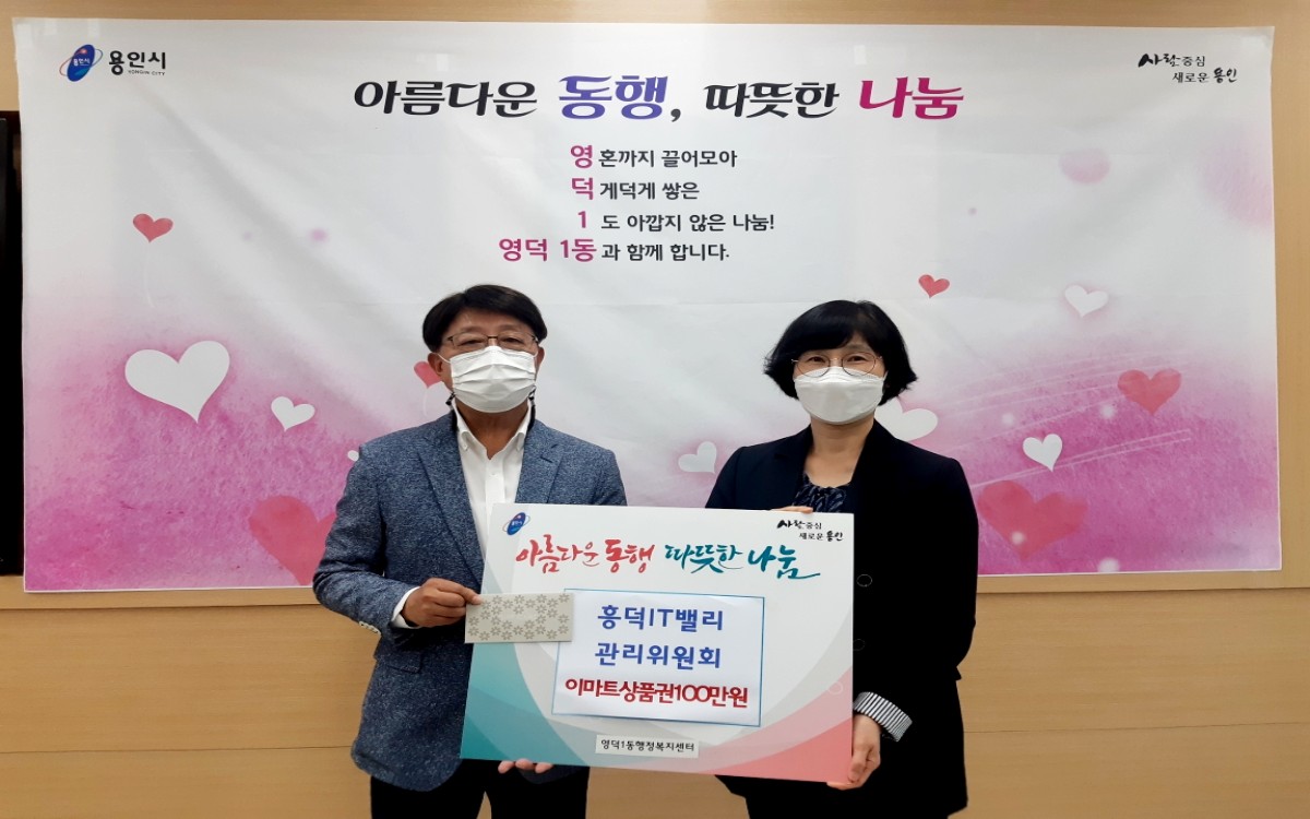 용인시 기흥구 영덕1동은 23일, 흥덕IT밸리센터 관리위원회가 관내 어려운 이웃을 위해 써 달라며 100만원 상당의 상품권을 기탁했다고 밝혔다.