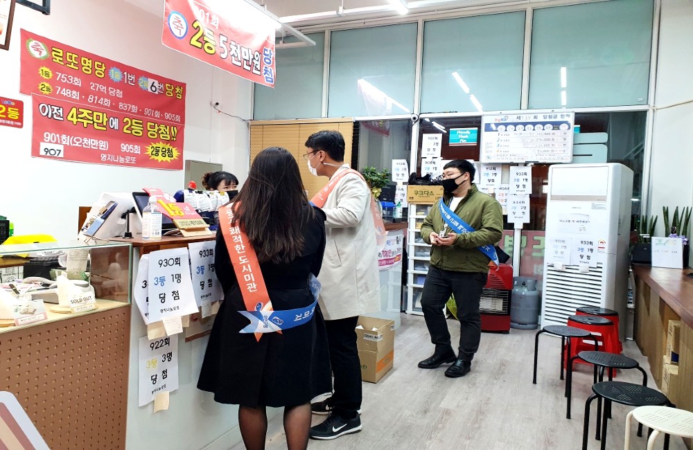 이날 구청 직원 20명은 상가 일대를 돌며, 시민들과 영업주를 대상으로 소독 티슈와 불법광고물 처벌 등의 내용이 담긴 안내문 500장을 배부하고, 통행에 지장을 주는 에어라이트, 배너 등을 정비했다.