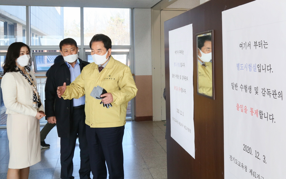 이들은 수험생 출입절차 및 시험실 방역 상태, 책상 칸막이 설치 여부 등을 확인하고, 유증상 수험생을 위한 별도시험실이 잘 준비되어 있는지를 꼼꼼히 점검했다.