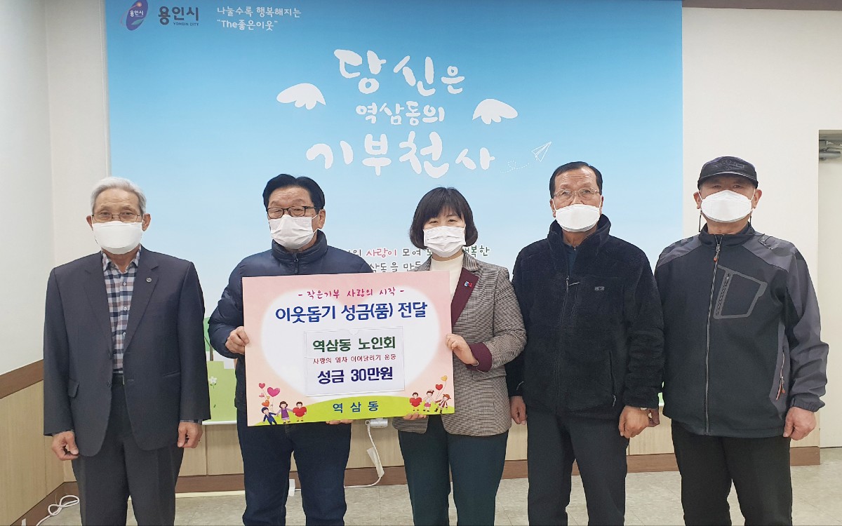 처인구 역삼동에는 노인회(회장 장병소)가 30만원을 기탁했다. 노인회는 어려운 처지의 이웃을 돕는 등 관내 복지사각지대 해소에 앞장서고 있으며 해마다 이웃돕기 성금을 모아 기부하고 있다.